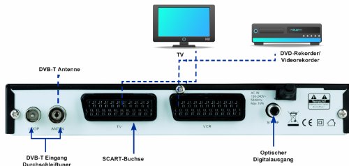 - Anschlüsse: 2 Scart, elektrischer Digitalausgang, Durchschleiftuner