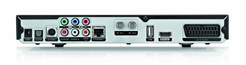 - Kartenleser (HD+ Karte), CI+/CI Schnittstelle, HDMI, SCART (TV), USB 2.0, Ethernet RJ45, Digitaler AC3-Audio (S/PDIF), Analog-Audio (Cinch li/re), Satelliten-Anschlüsse, Anschluss für externes Netzteil